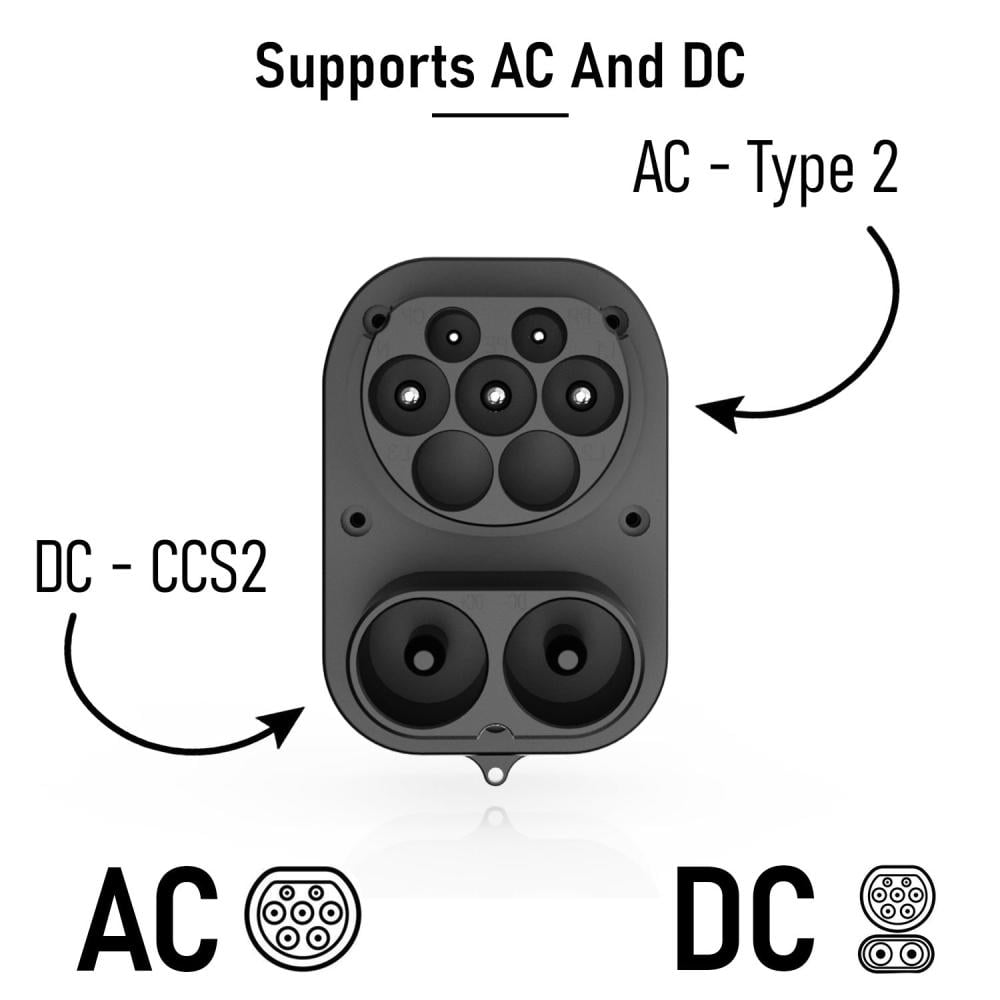 أيضًا متوافق مع جميع محطات الشحن CCS2 DC و AC نوع 2 (بما في ذلك محطات الشحن السوبر لتسلا)